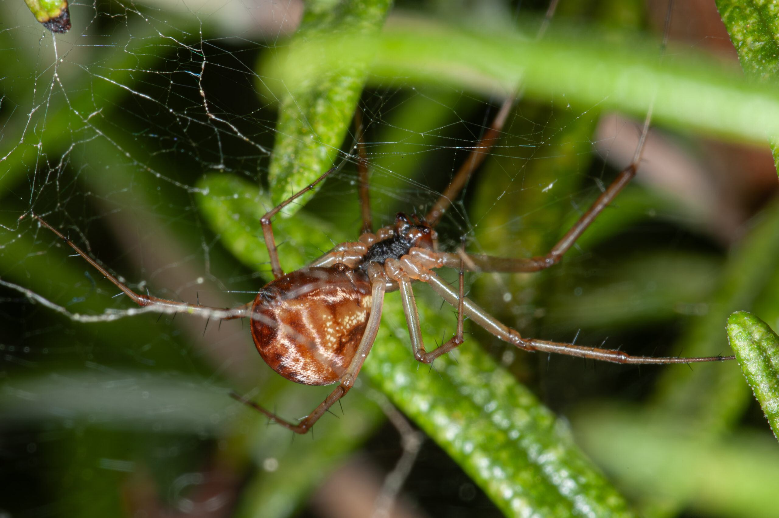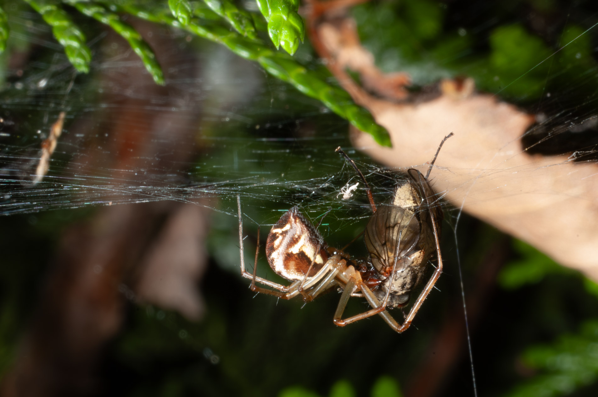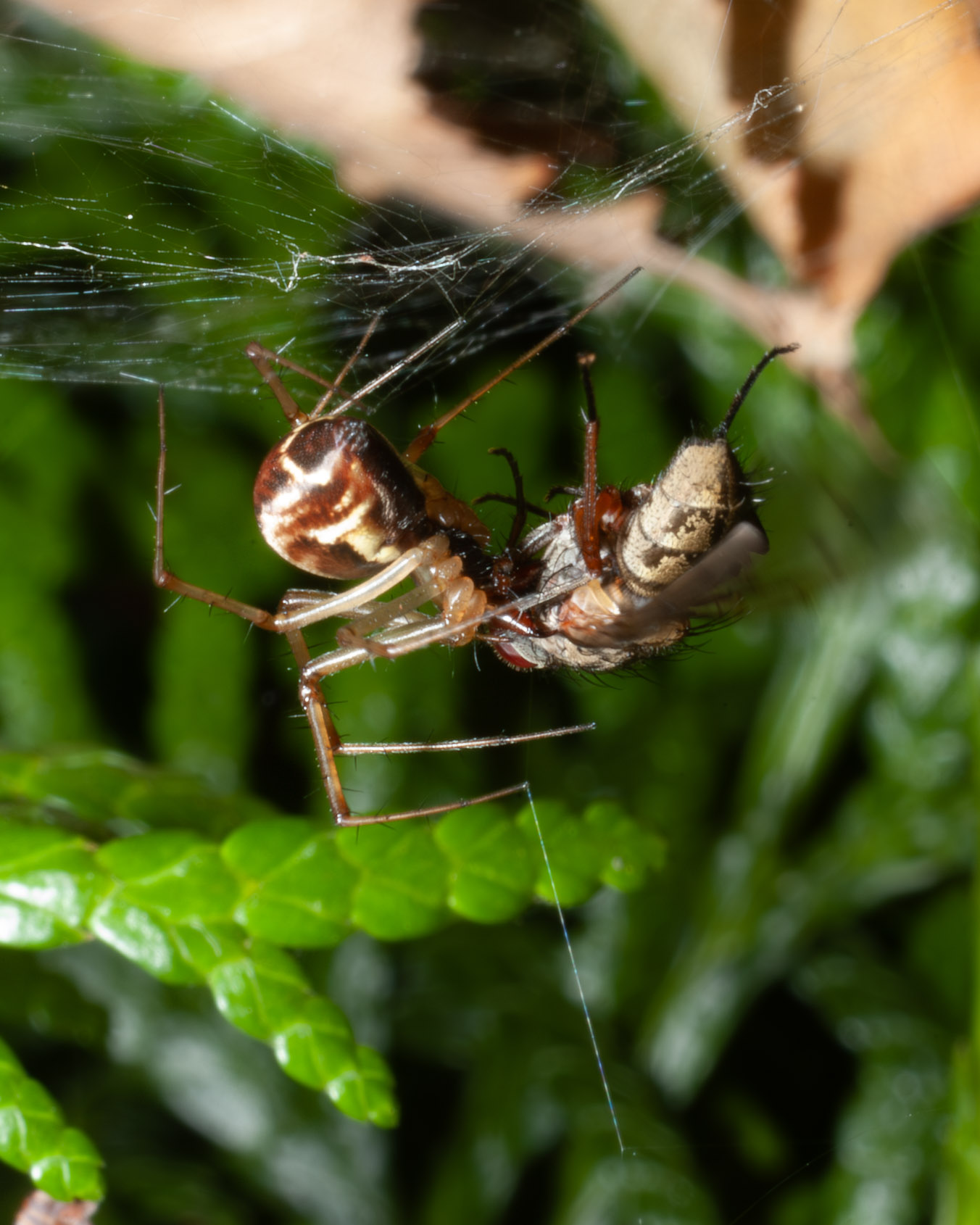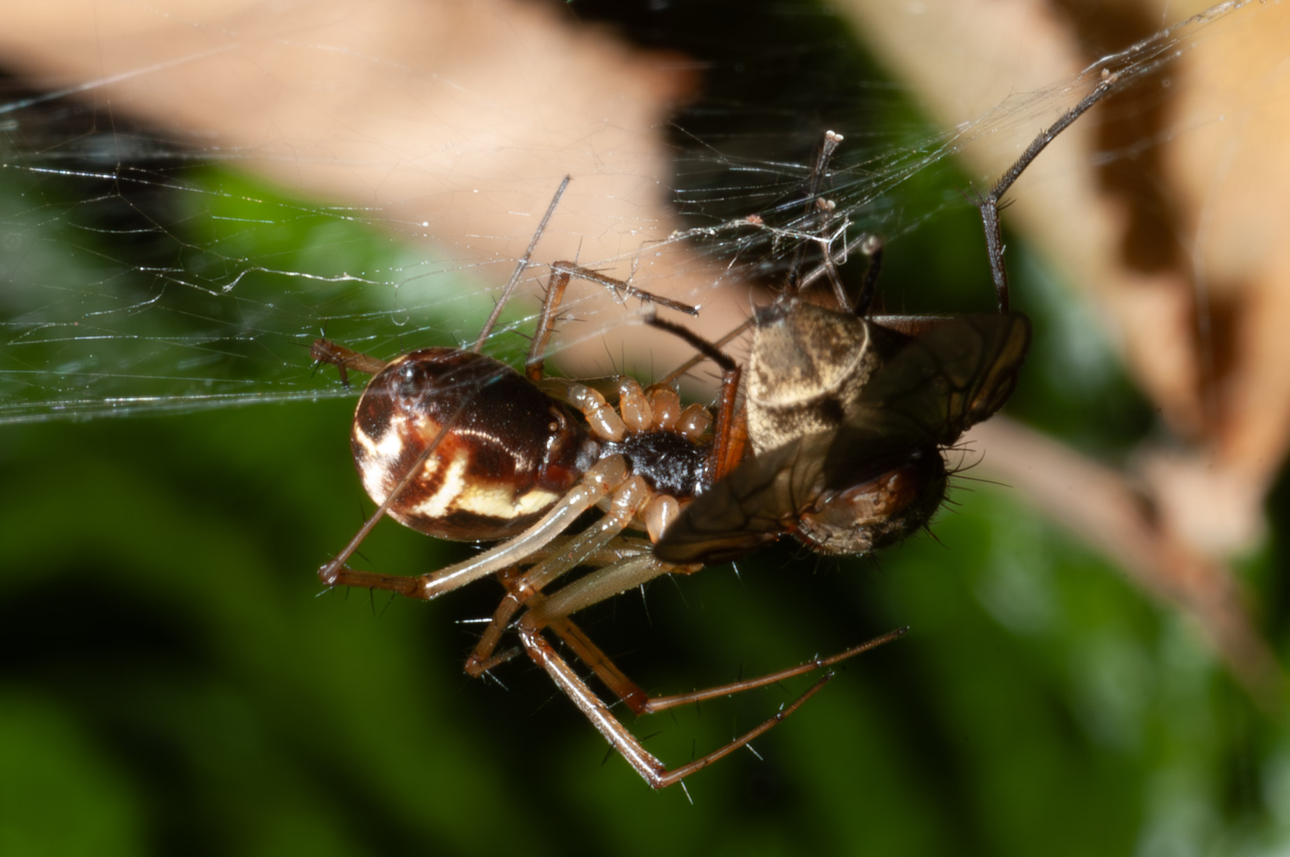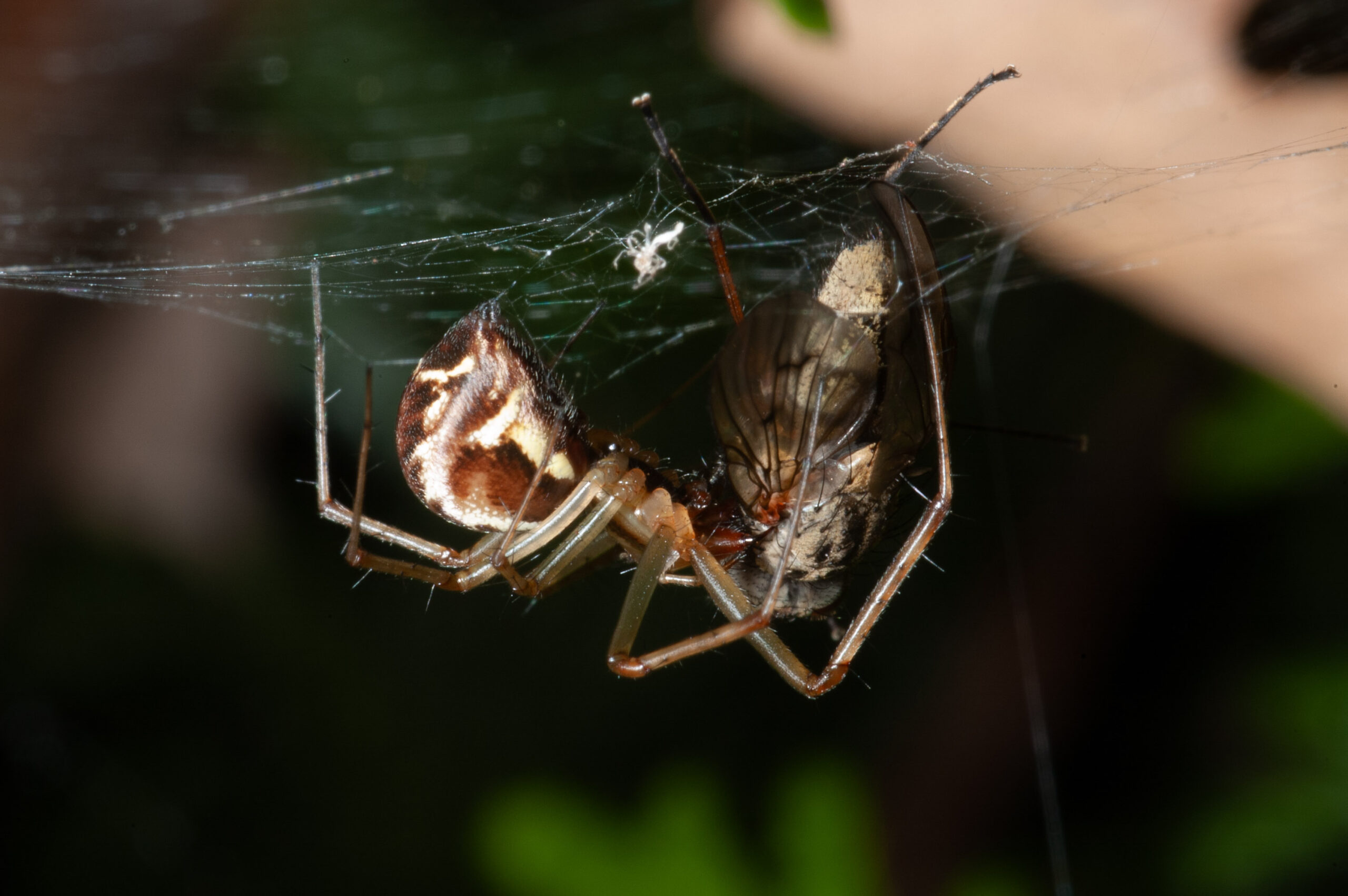 En een herfsthangmatspin die een vlieg gevangen heeft: