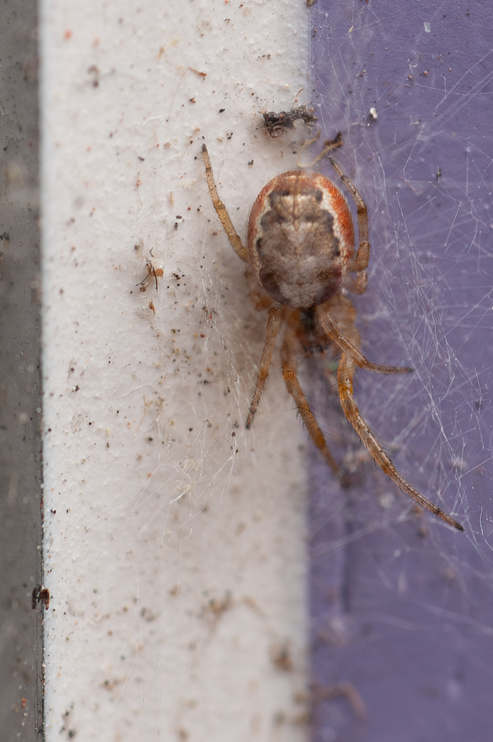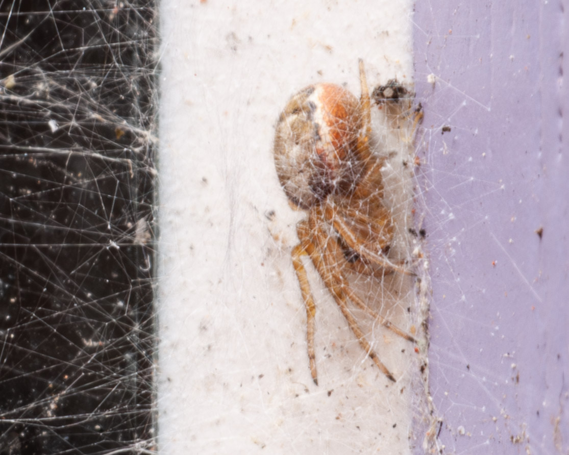 We hebben sinds jaar en dag venstersectorspinnen aan de buitenkant van de vensters, maar als ik de AI’s in mijn telefoon moet geloven, is dit een struiksectorspin. Die redelijk zeldzaam is. (Voor hetzelfde geld is het gewoon een jong exemplaar van de venstersectorspin, natuurlijk.)