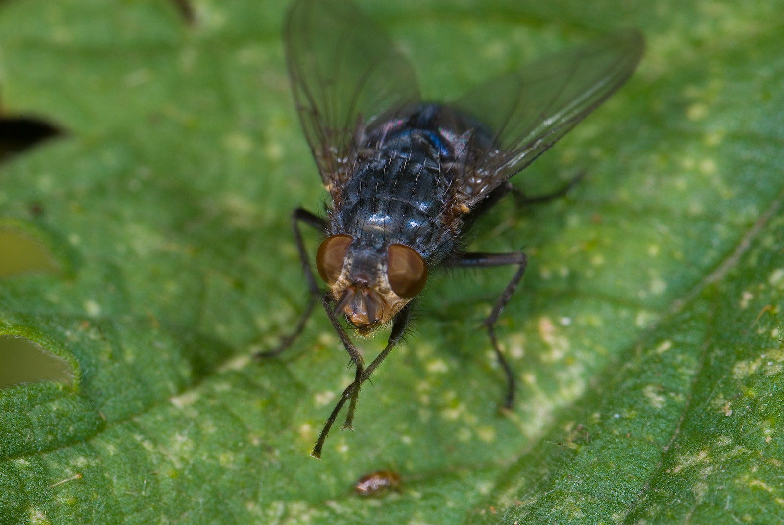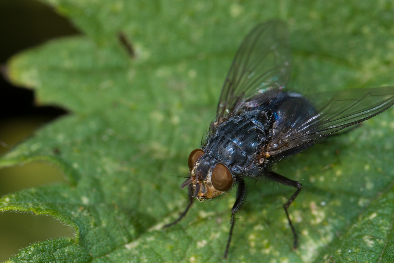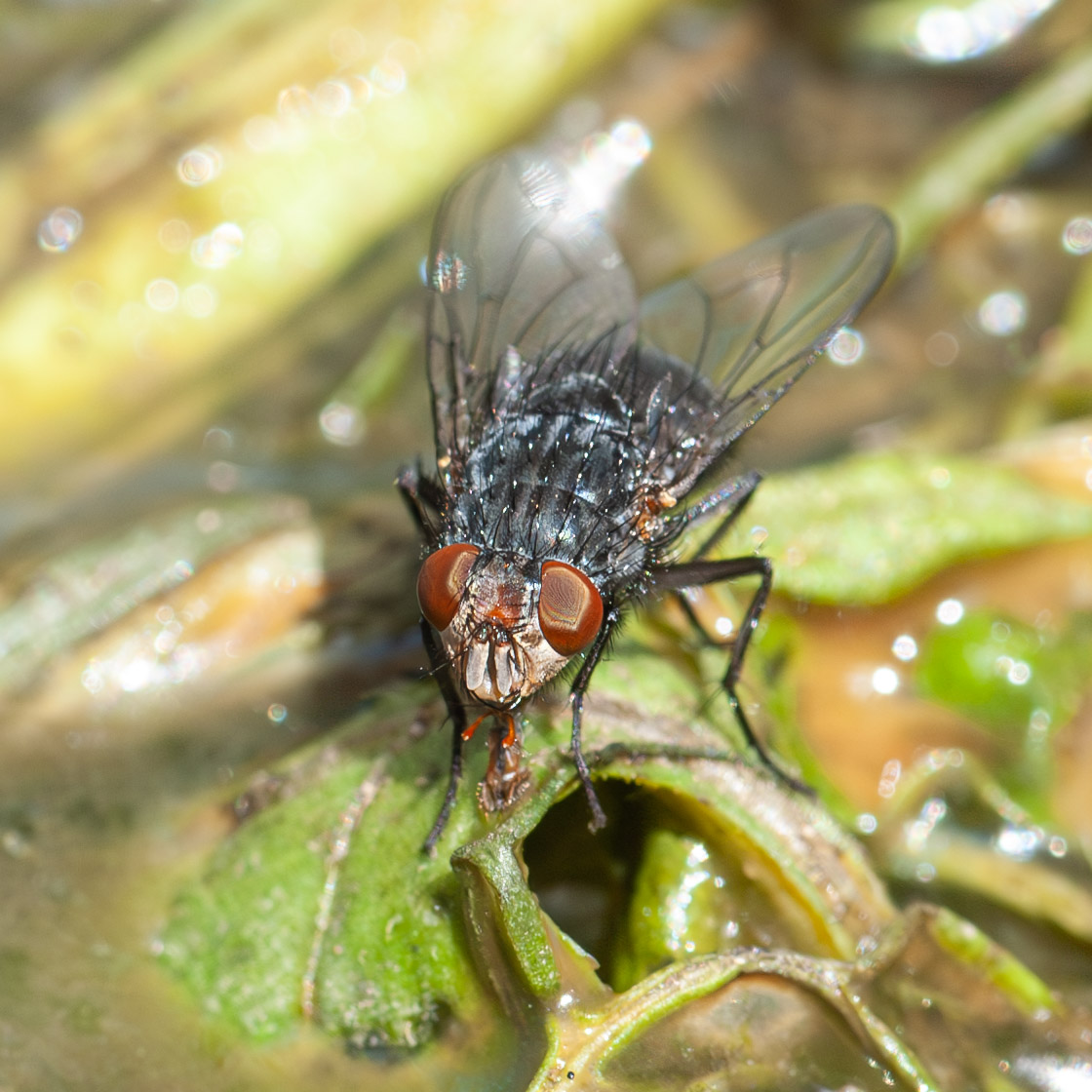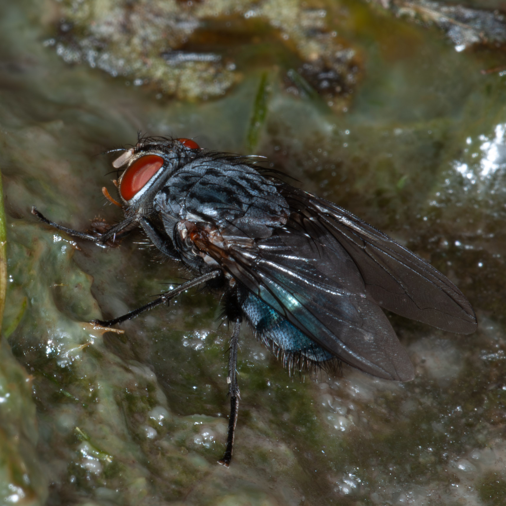 De roodwangbromvlieg is een vleesvlieg die hard lijkt op de blauwe vleesvlieg en ook blauw is, maar roodoranje wangen heeft en vandaar de naam.
