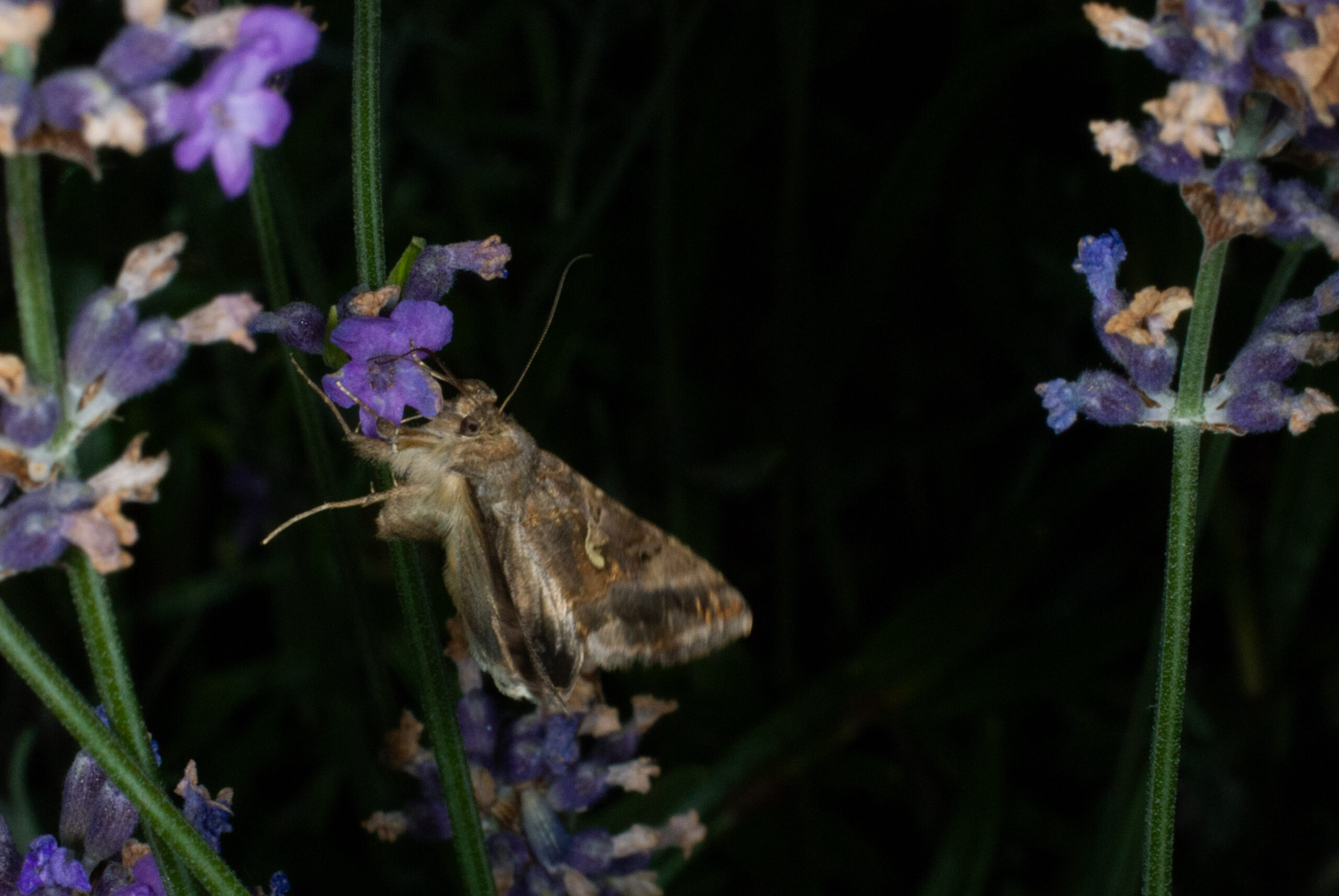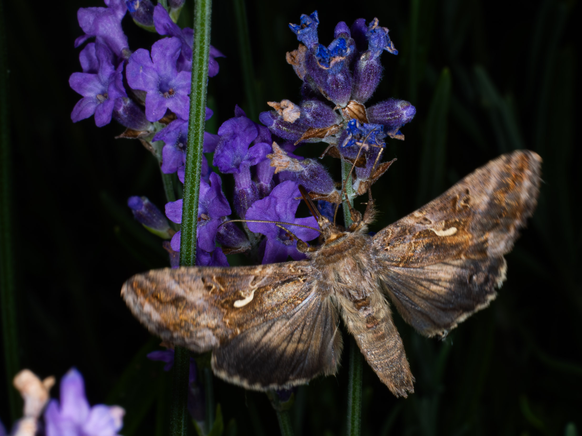 De gamma-uil is een kleine bruine uilvlinder die dag en nacht actief kan zijn. Toen we nog een aantal zeer grote vlinderstruiken hadden, zaten er regelmatig op. Tegenwoordig vooral ’s nachts op de lavendel.