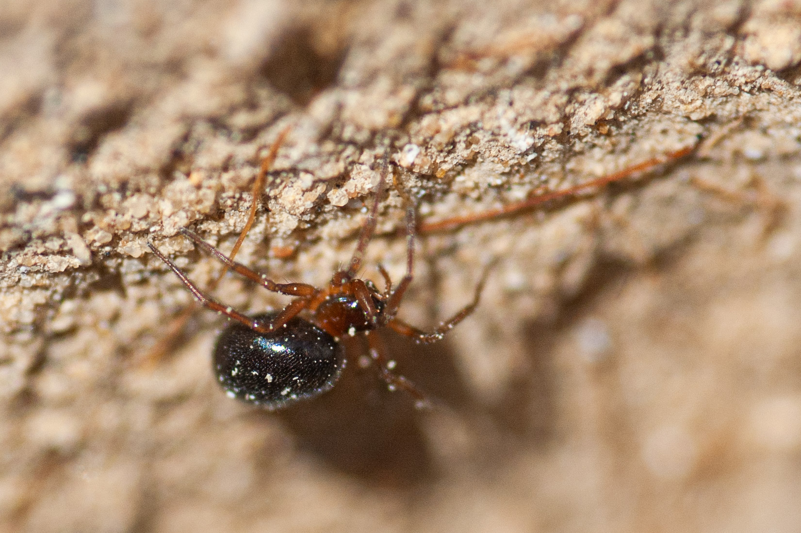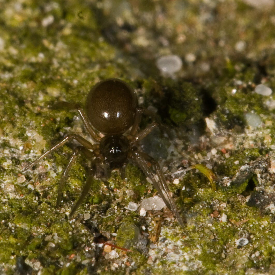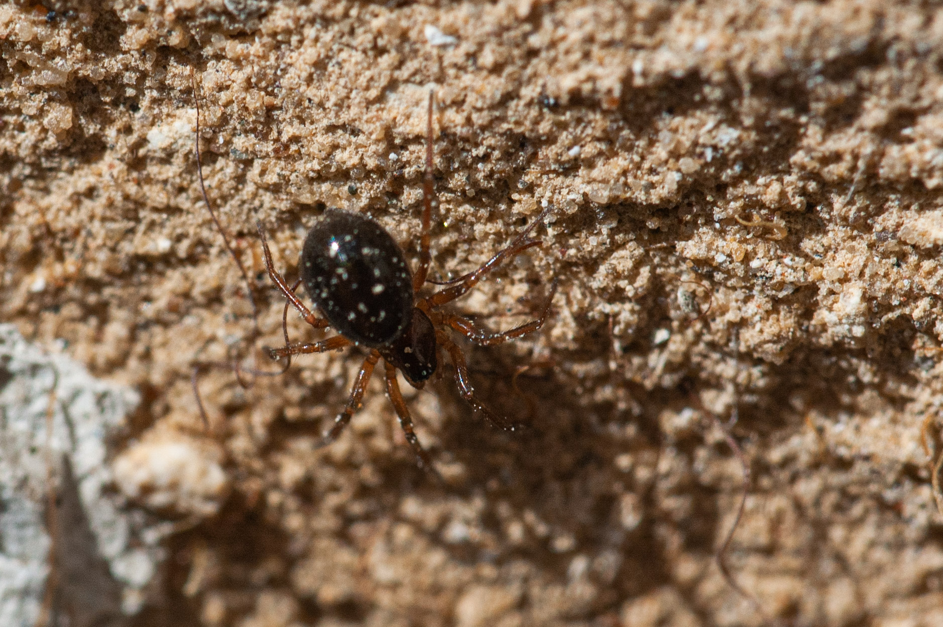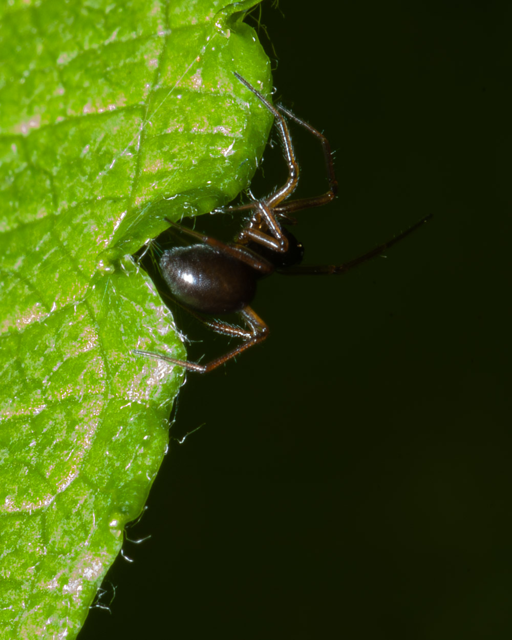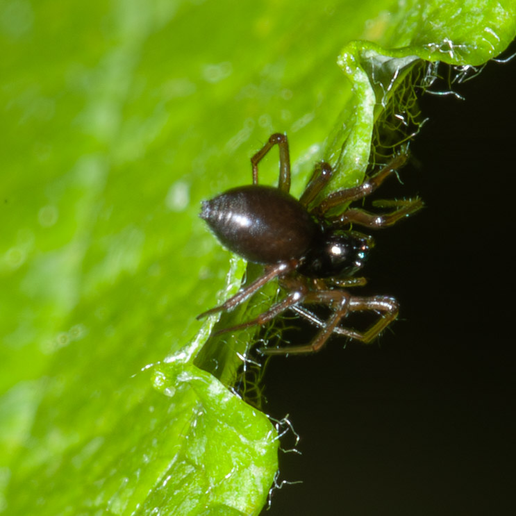 Als ik al dacht dat de spinnetjes hierboven klein waren: dit is nog kleiner — ik schat dat niet groter dan een millimeter. Zat in een bos platte peterselie die ik gekocht had, ik zag ineens een klein zwart dingetje bewegen op het werkblad. Kleiner dan een kleine springstaart.