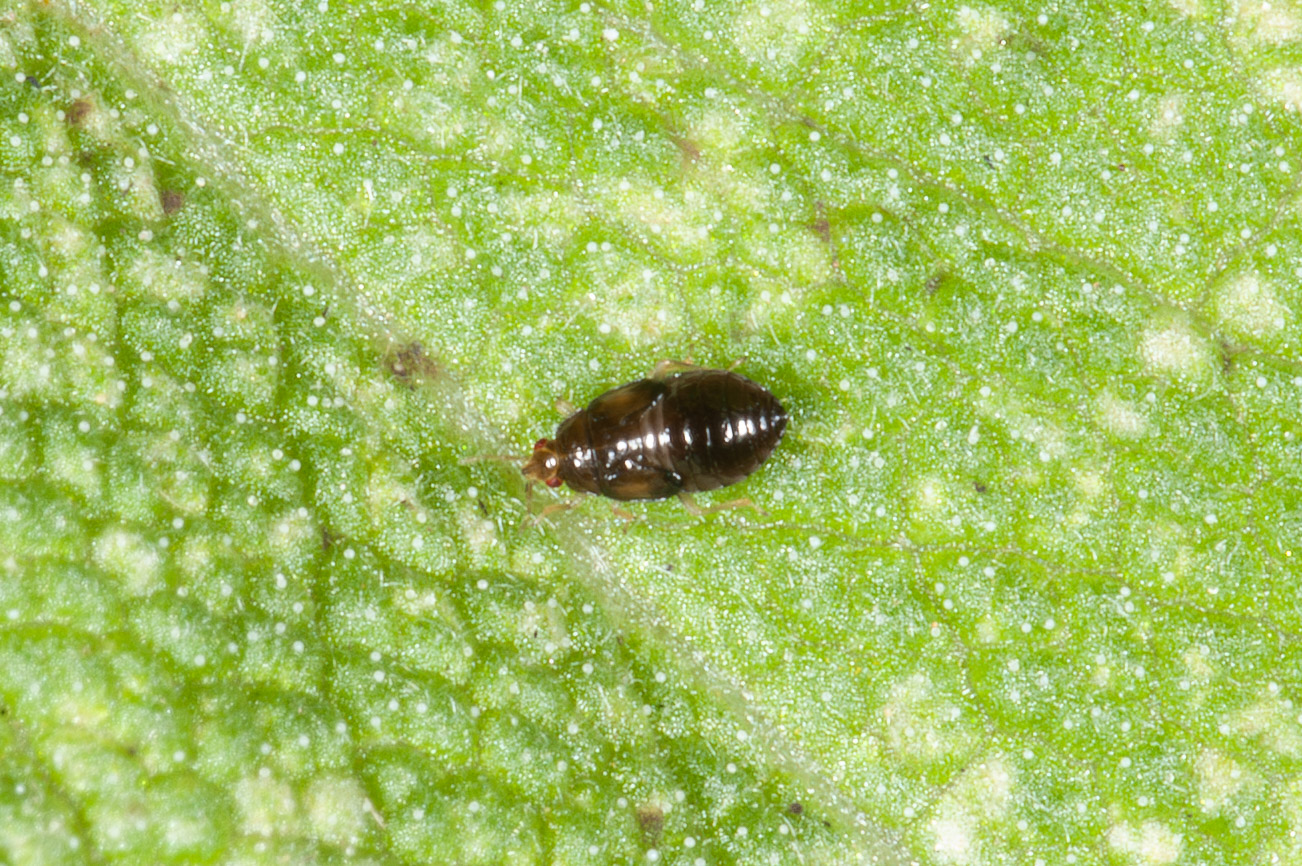 Een bloemwants, ongeveer twee millimeter klein. Een roofwants die bij gebrek aan prooi ook wel eens stuifmeel eet.