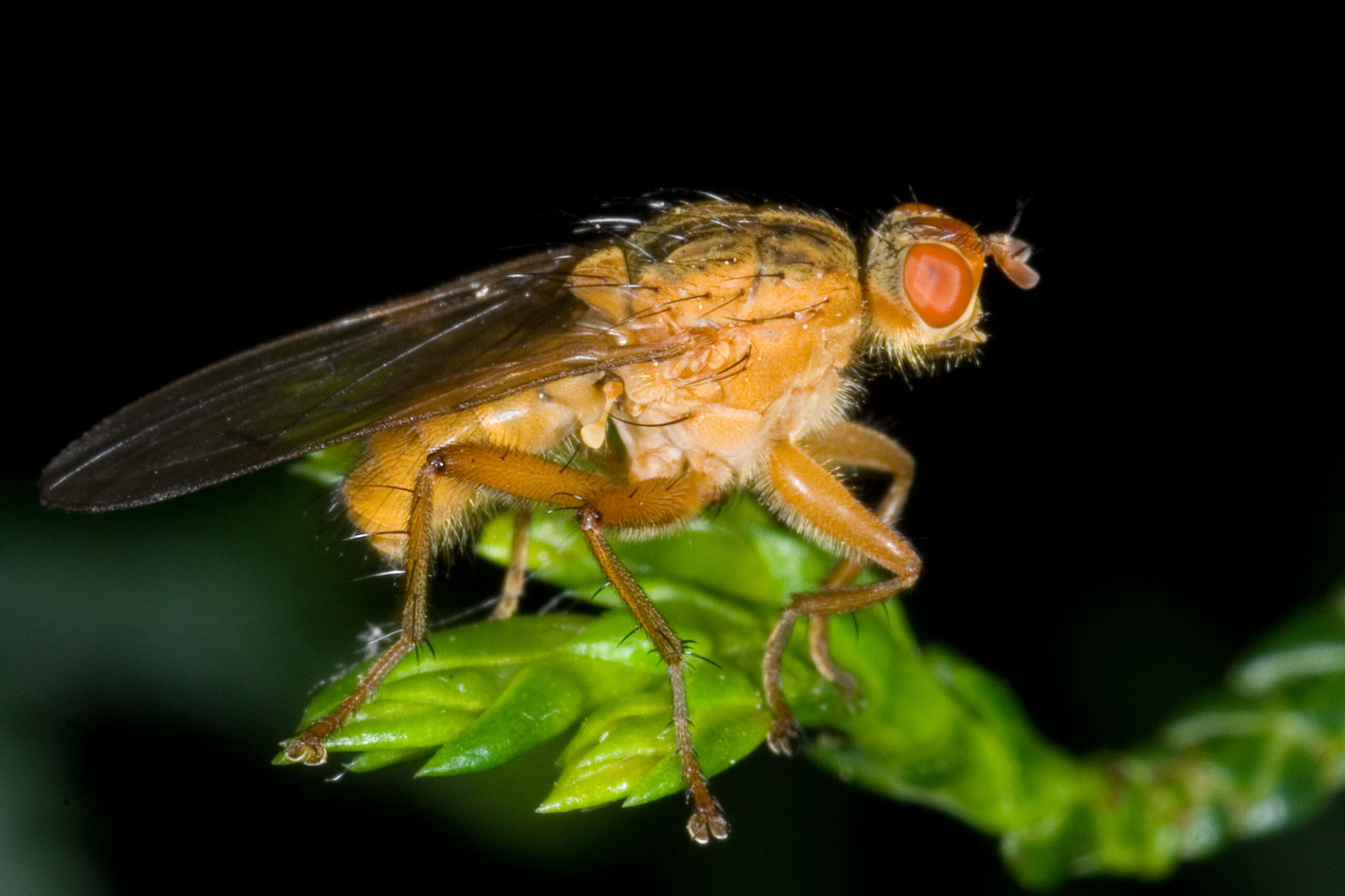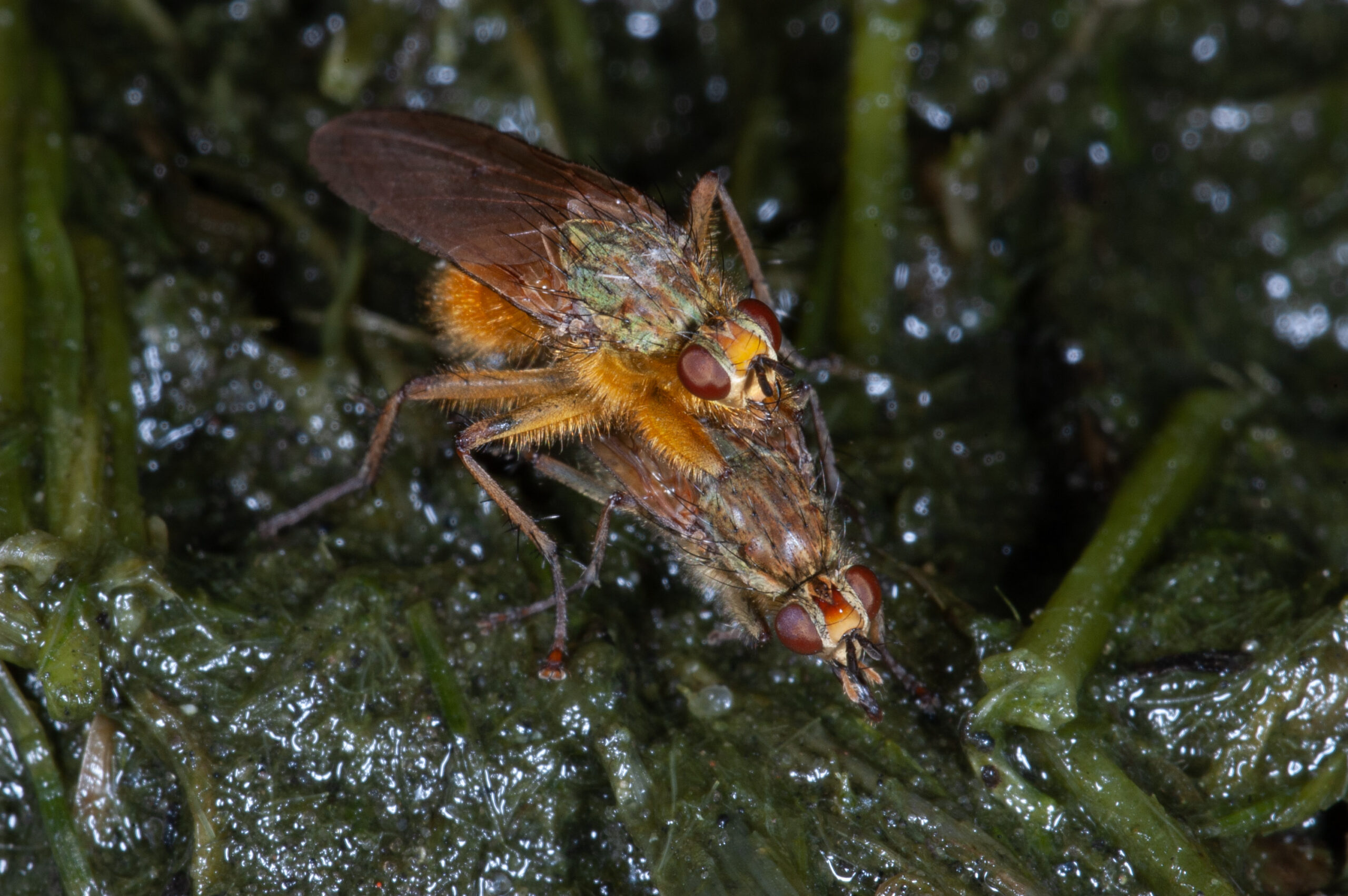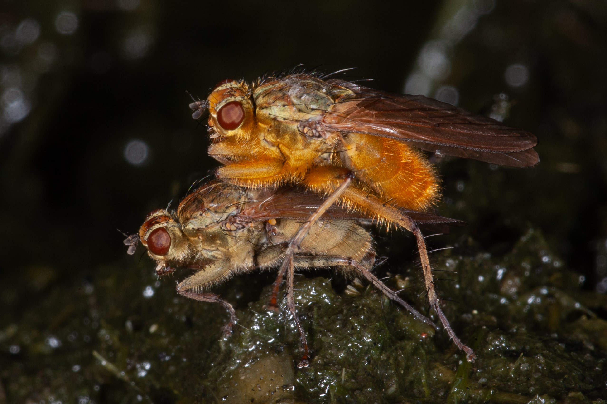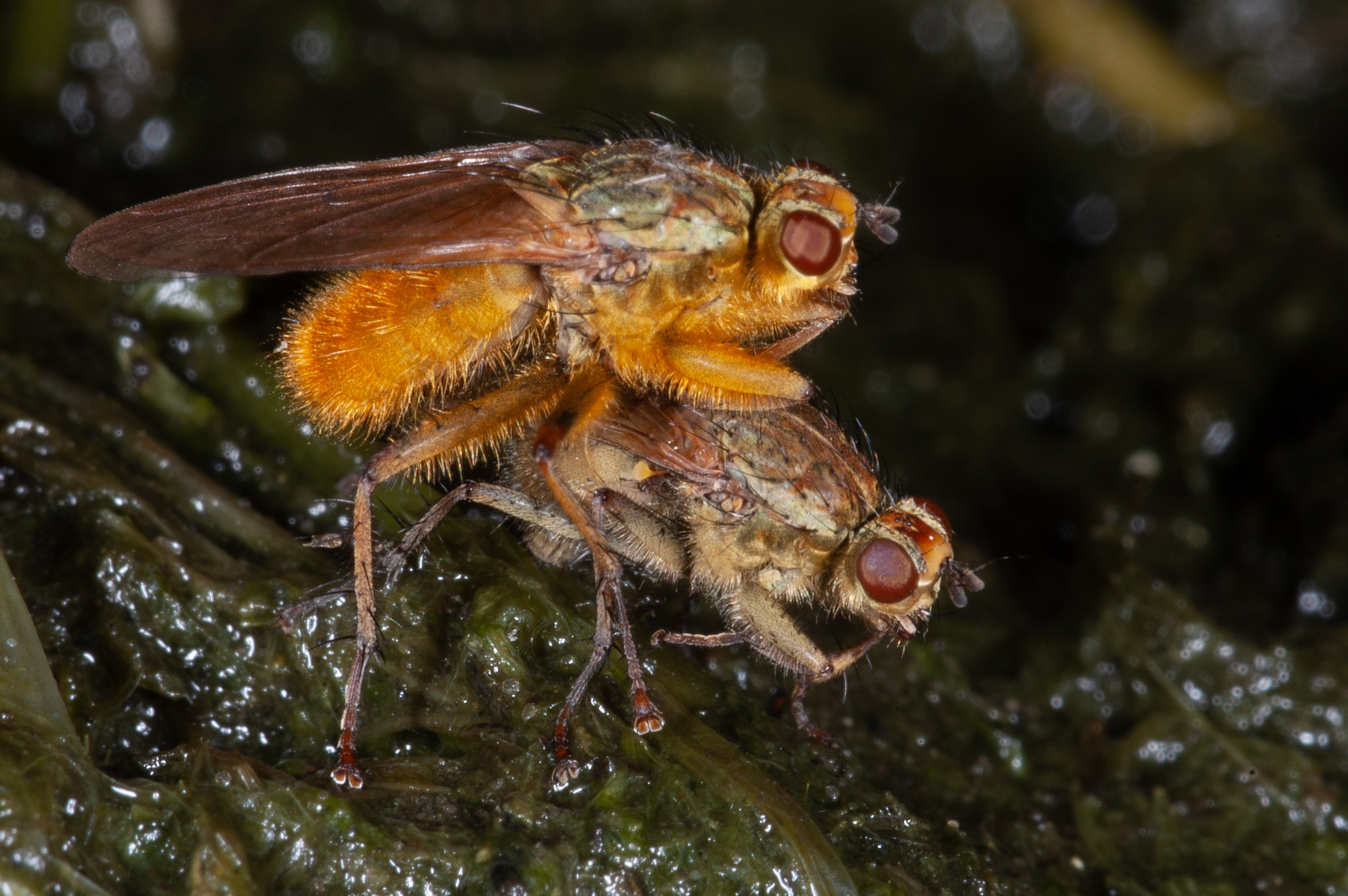 Deze vliegen in augustus 2004 waren het beest met twee ruggen aan het maken in de buurt van een emmer waar ik bladeren in had laten rotten (specifiek om beesten aan te trekken, jawel). Die bovenste is bijna onnatuurlijk oranje, weird.