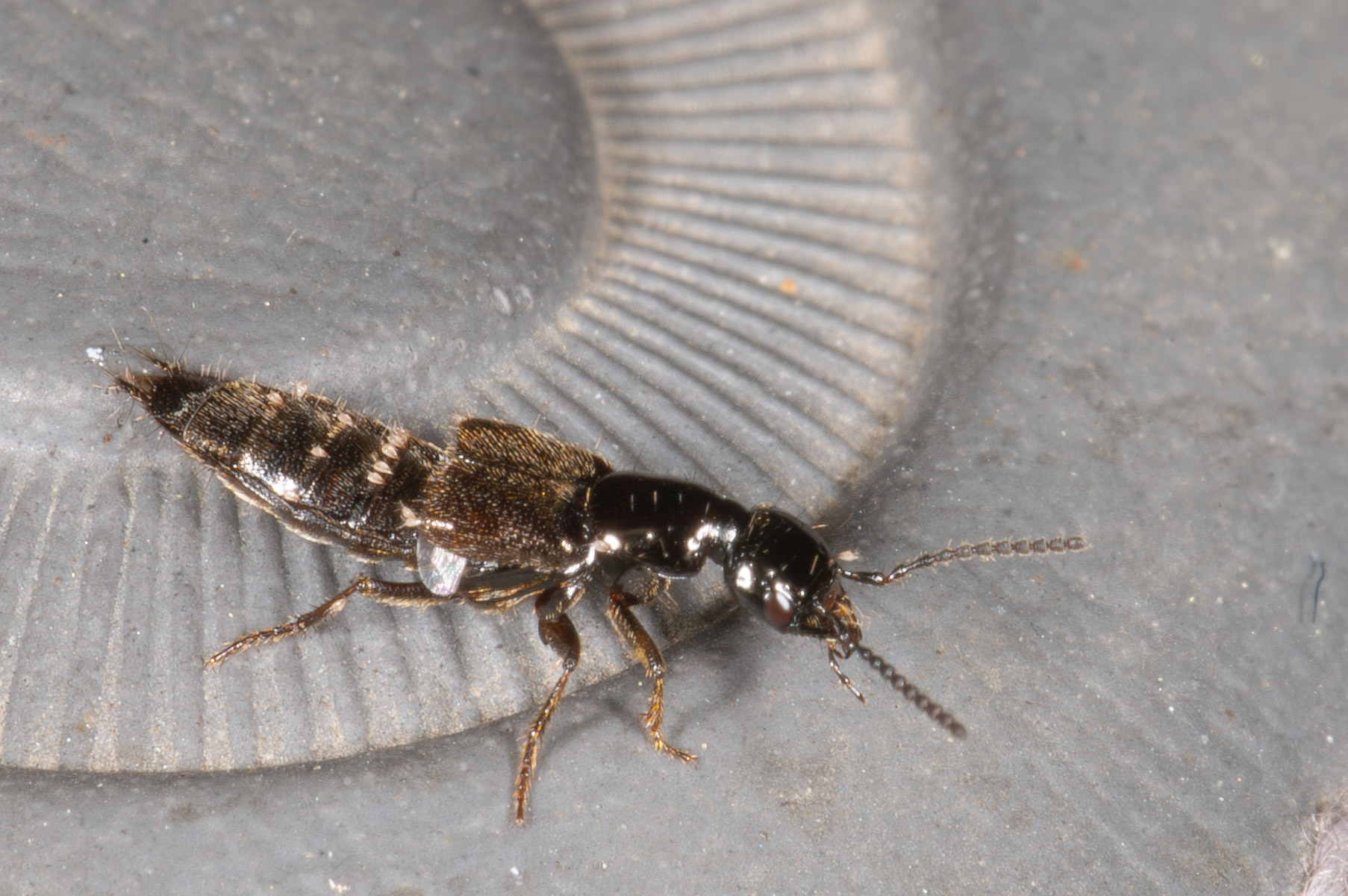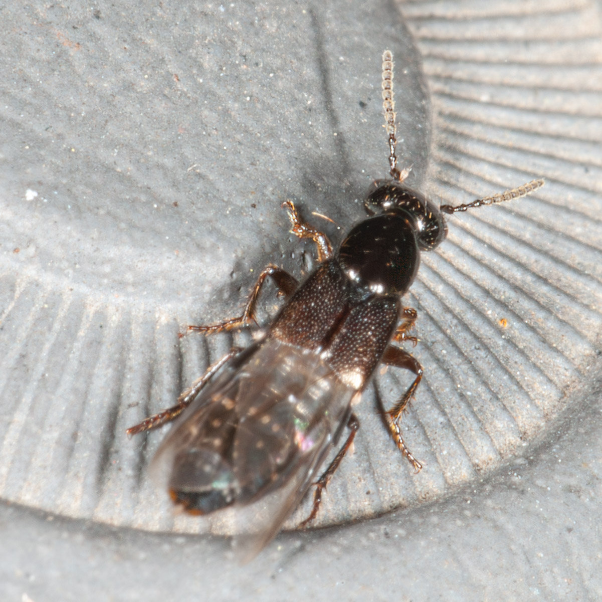 Een onbekende kortschildkever. Al die beesten trekken op mekaar — ik dacht dat de foto’s gedetailleer genoeg waren om minstens een stapje lager dan het algemene “kortschildkever” te geraken, maar neen dus.