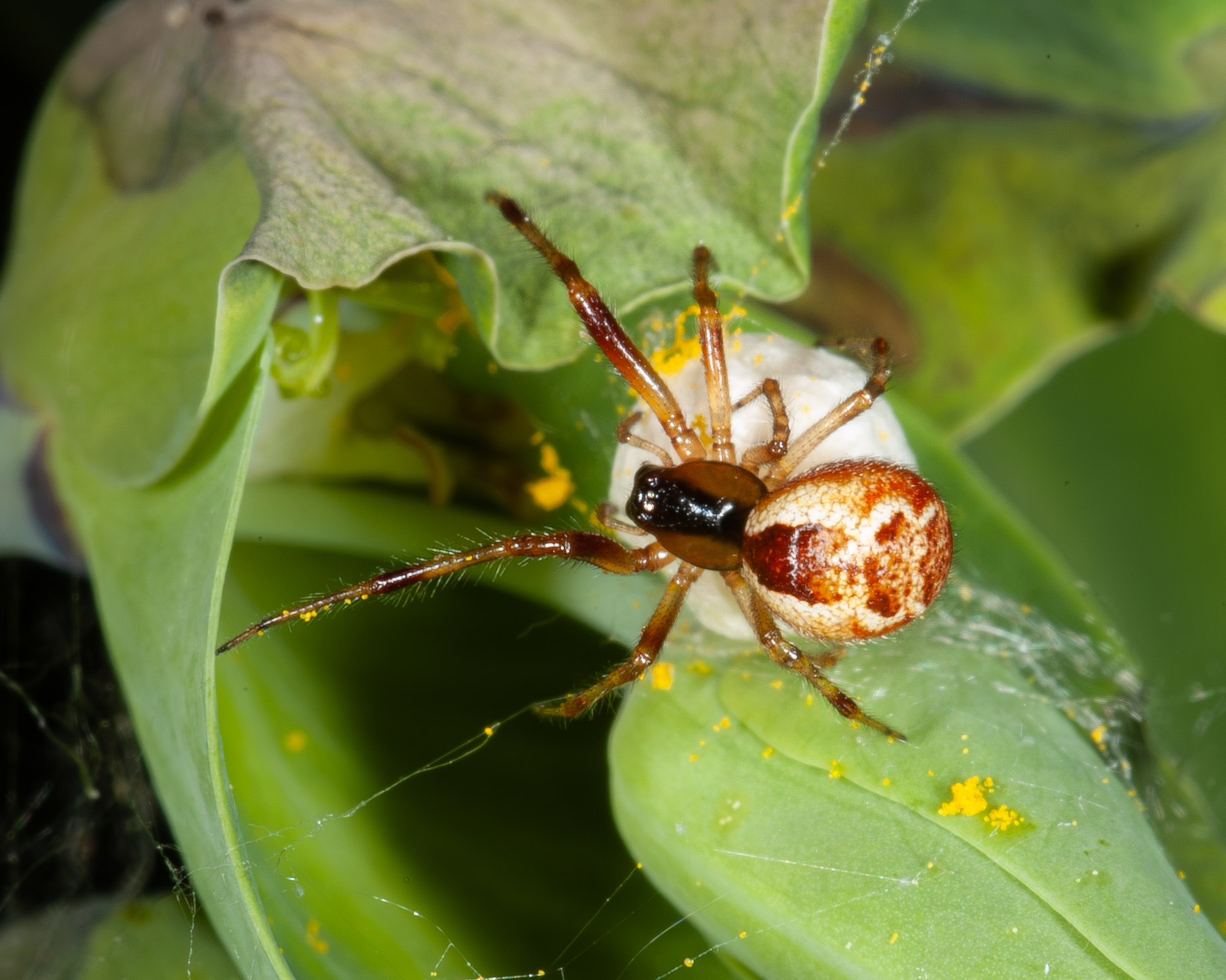 Een slanke kogelspin. Vrouwtje met eieren in juni 2005: