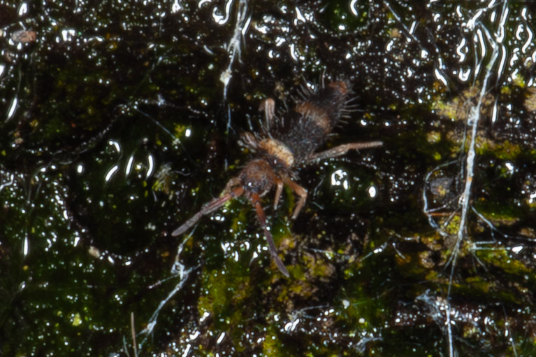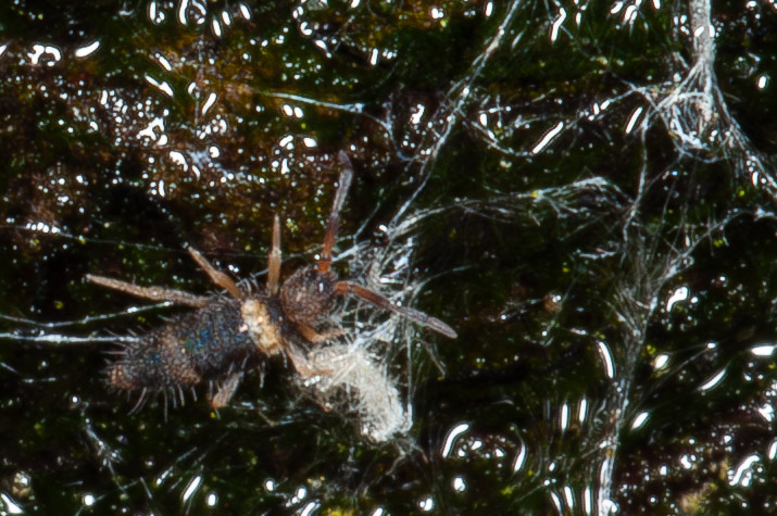 Een springstaat met drie gele strepen: het eerste segment aan zijn borststuk, de voorrand van het vierde segment van zijn achterlijf, en het laatste segment.