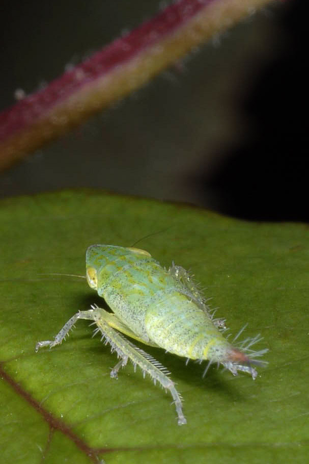 Een dwergcicade die op de rozen zat en waar ik nog nooit een volwassen beest van gezien had. Dit jonge exemplaar zag ik in augustus 2006.