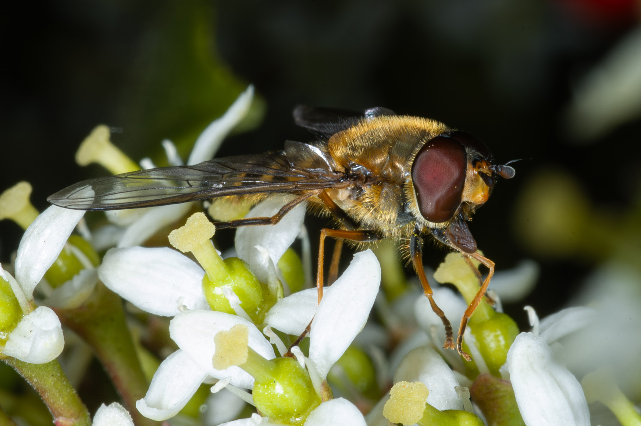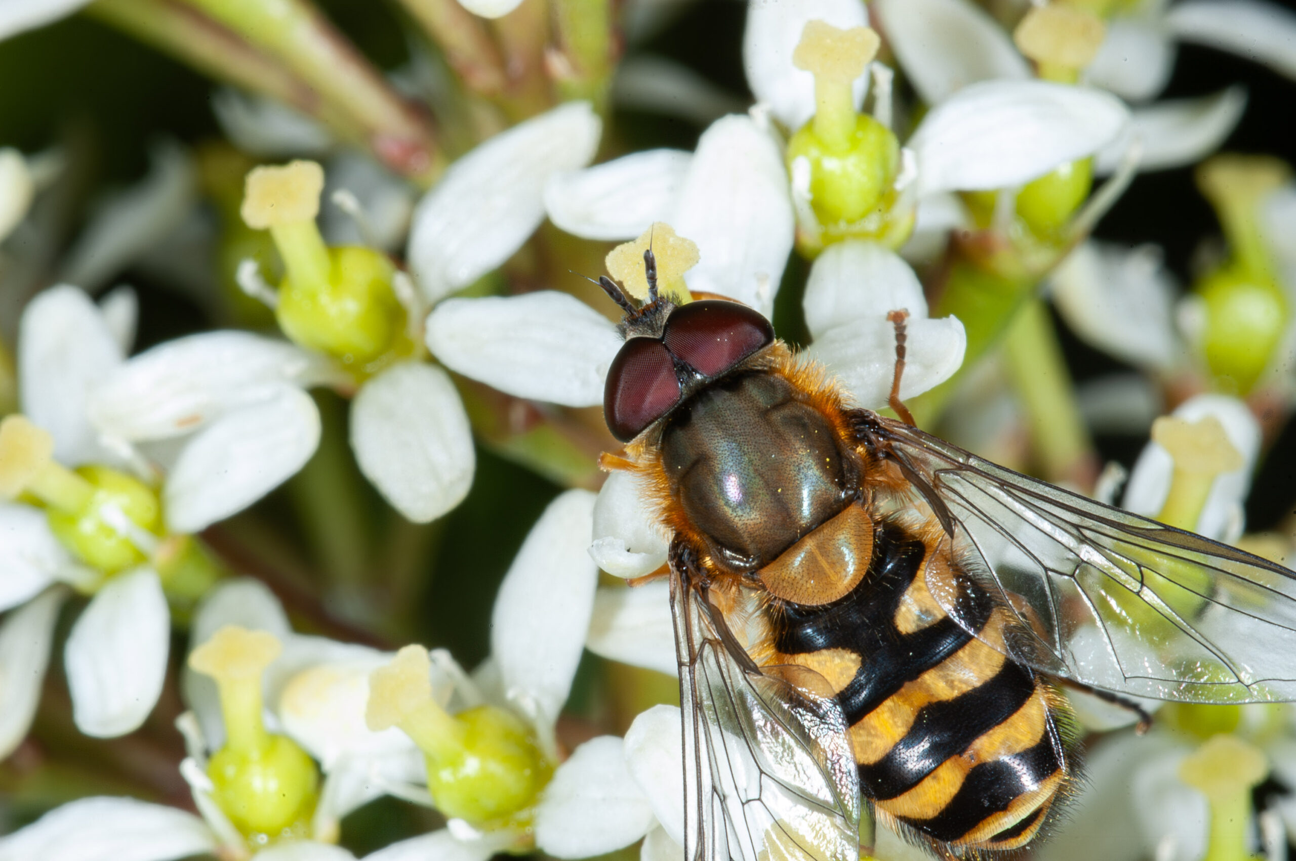 Een bosbandzweefvlieg, één van de vele zweefvliegen die doen alsof ze een wesp zijn.