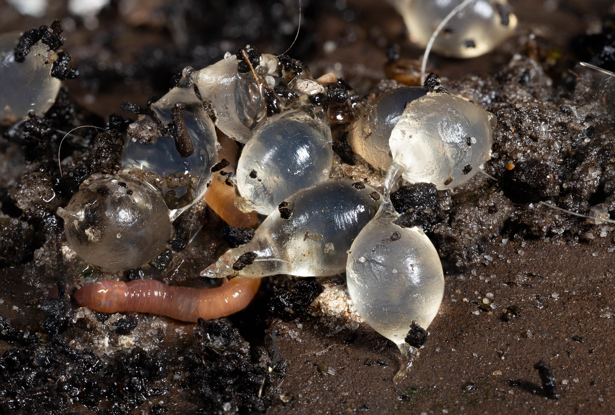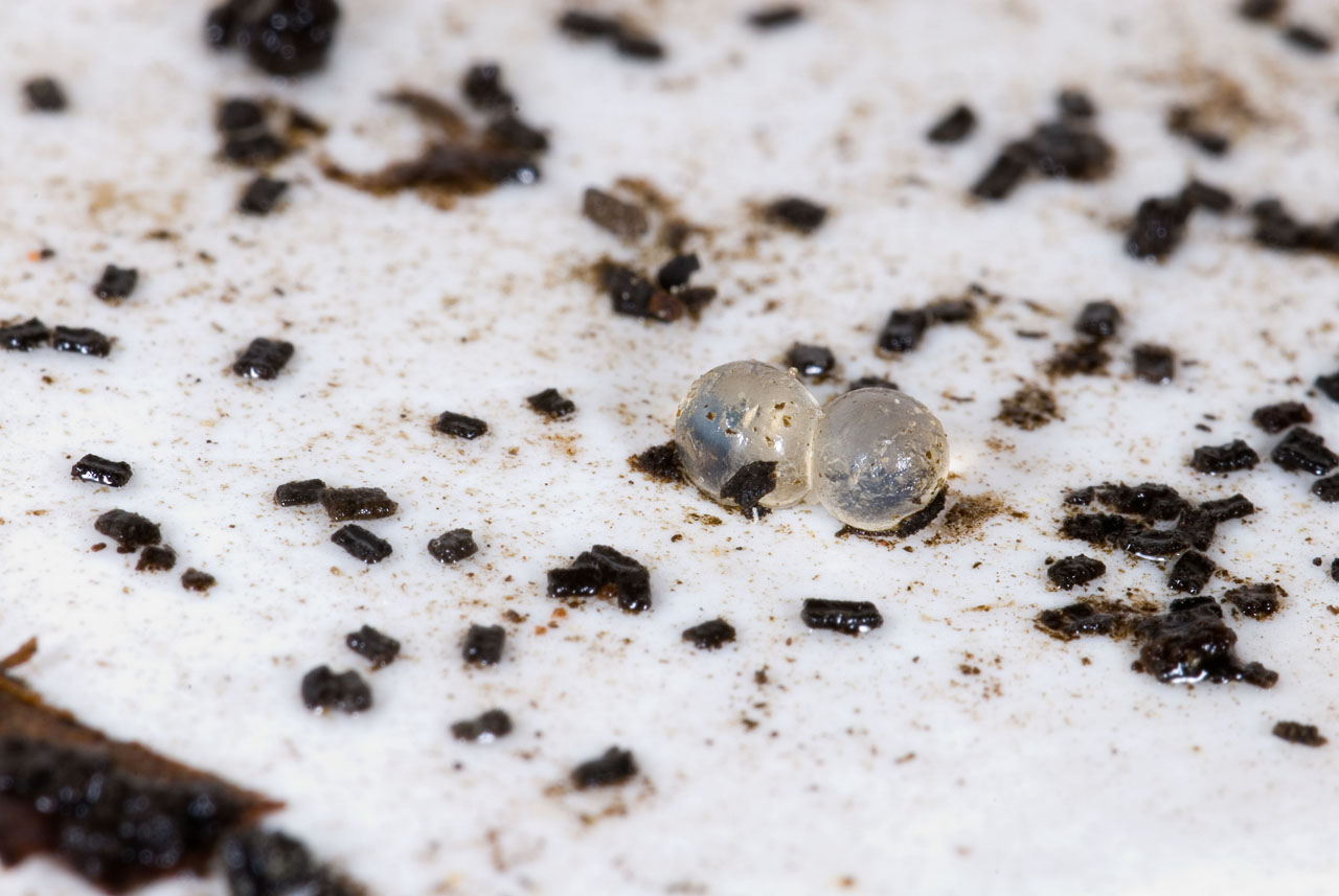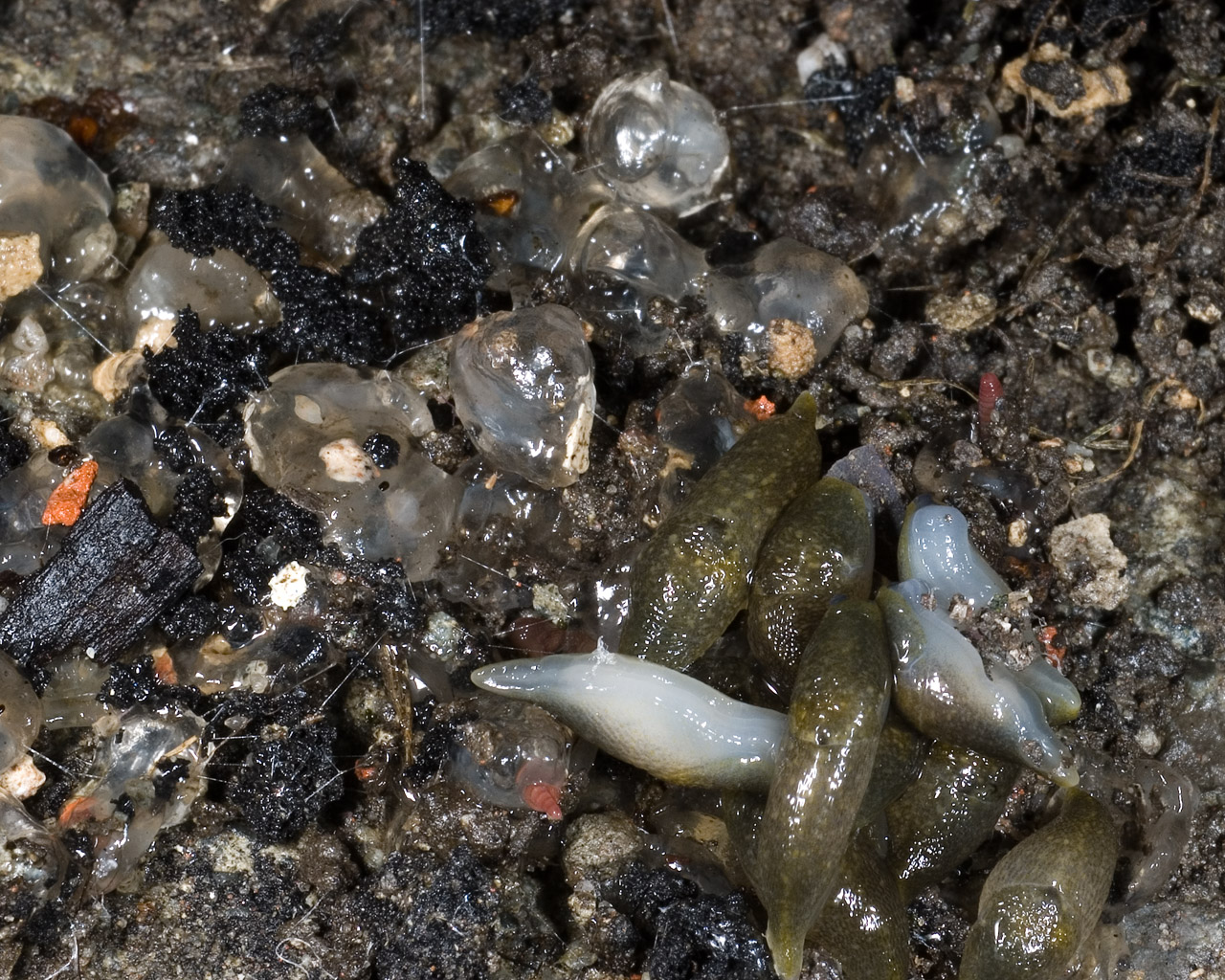 De grote wegslak is de meest voorkomende naaktslak in de buurt. Hieronder: eieren, net uitgekomen eieren. Van dénk ik de grote wegslak. Blijkbaar zitten er bij ons veel meer lichte aardslakken.