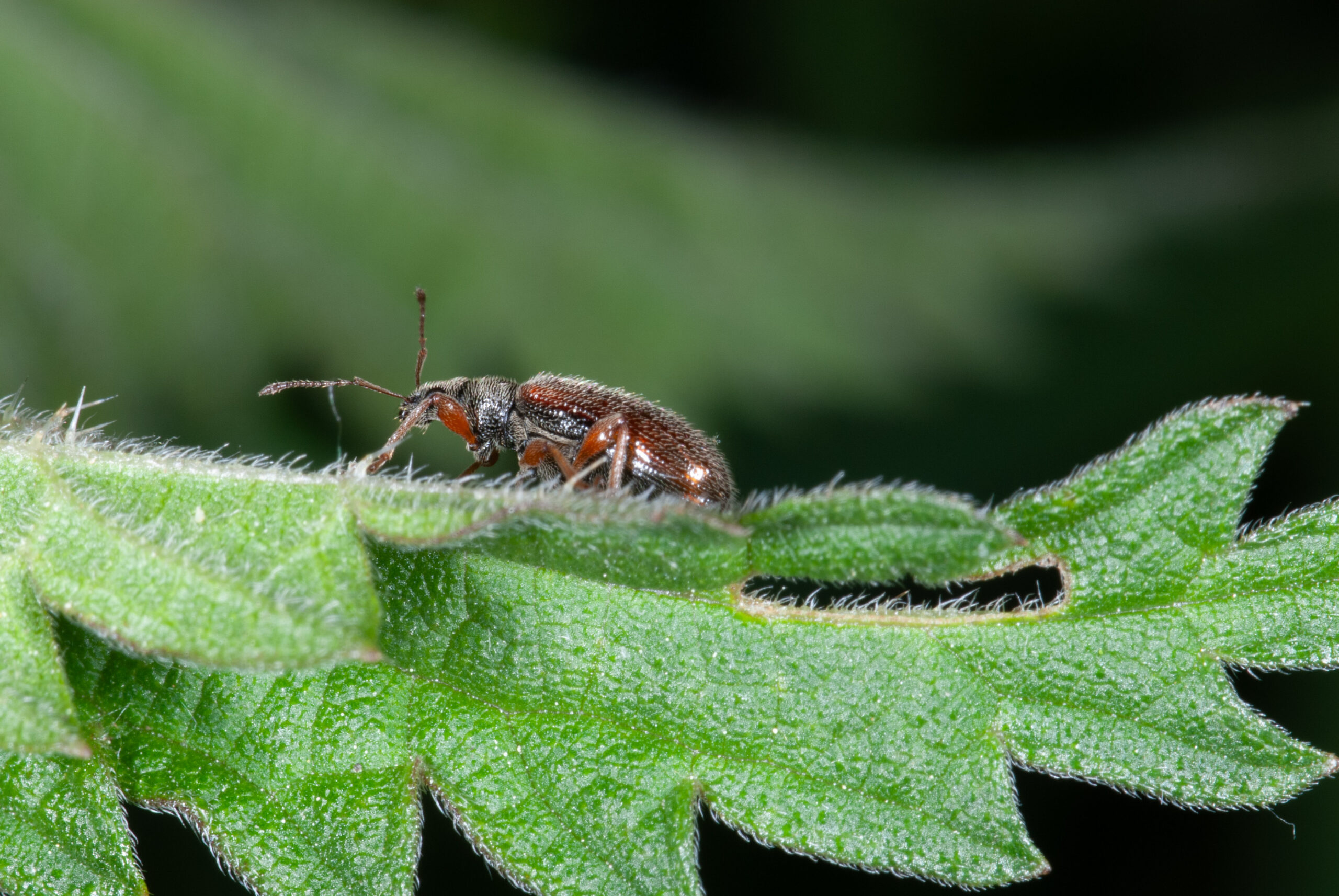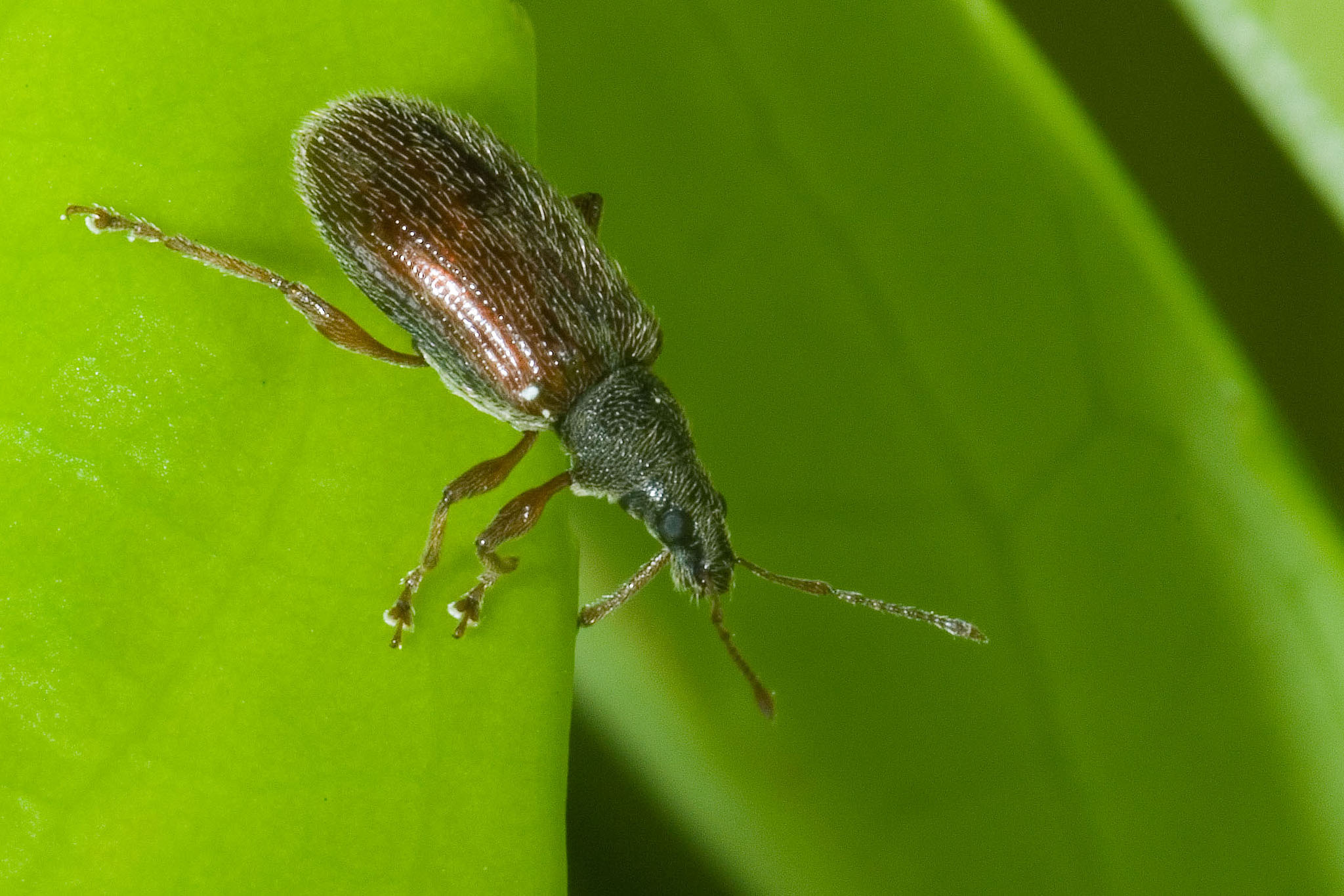 De behaarde bladsnuitkever of bruine vruchtboomsnuittor eet bladeren van bnomen. De larven eten wortels van onder meer aardbeiplanten. Deze zat op een paplaurier waaronder wilde aardbeien stonden.