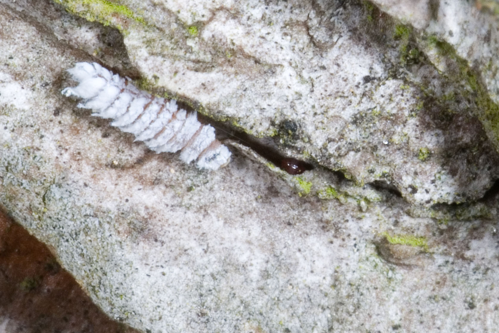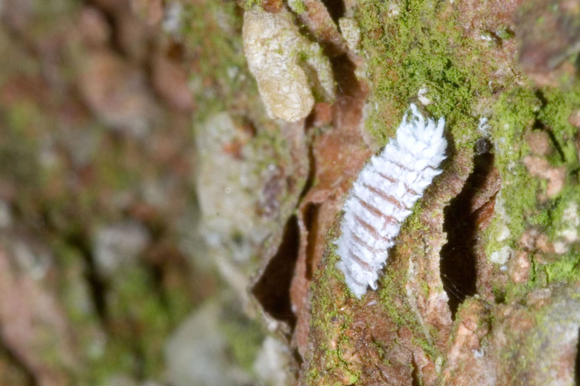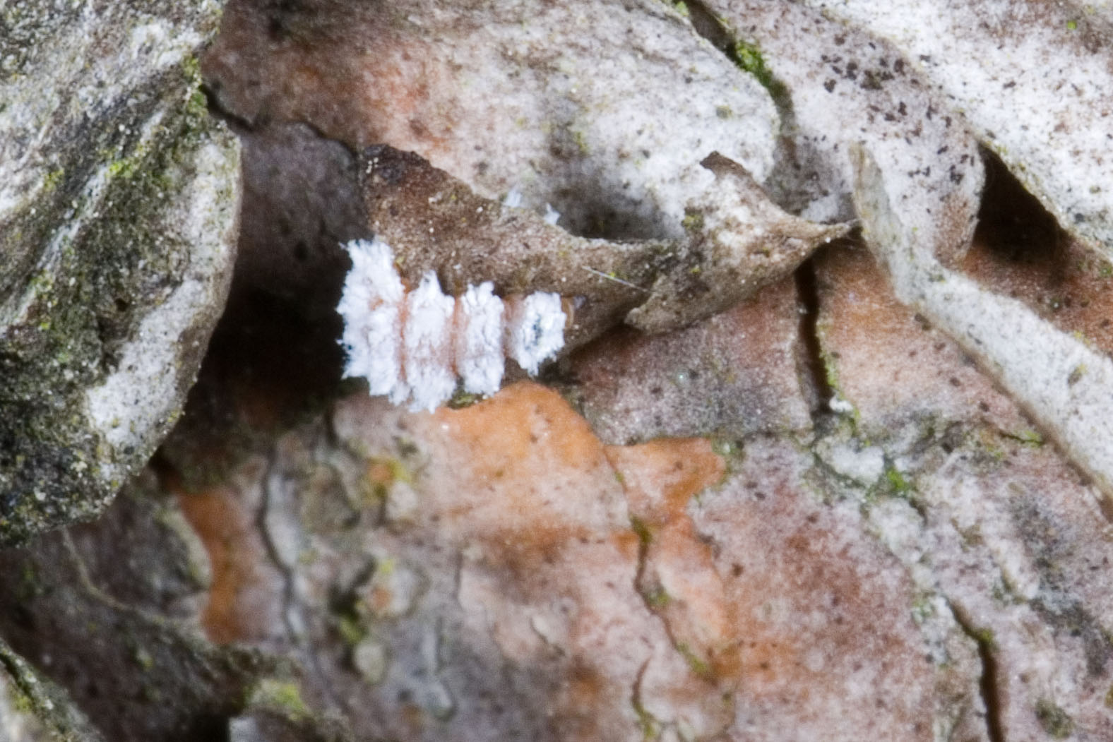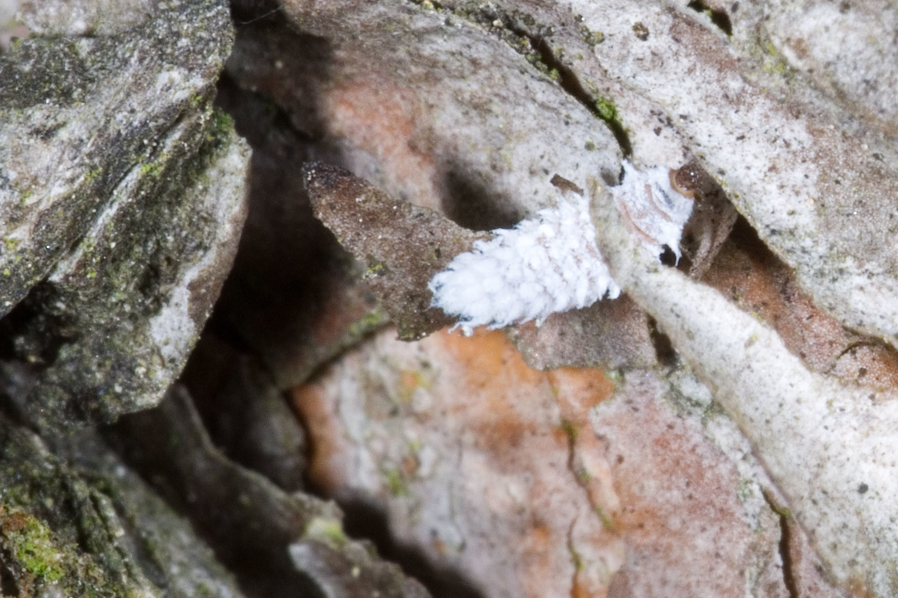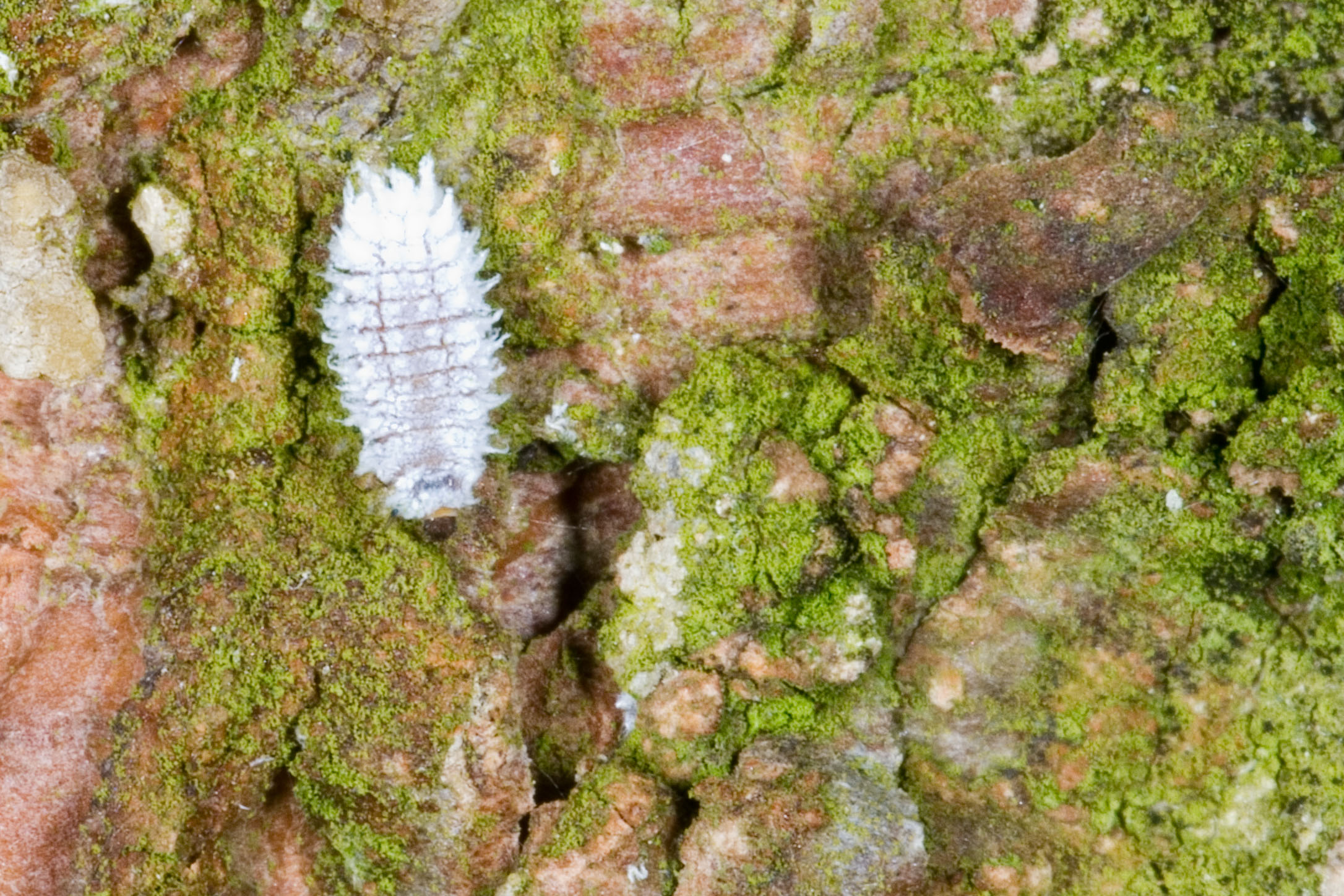 Ik heb nog geen volwassen beesten gezien, maar wel al deze larven van het dennenkapoentje, een klein lieveheersbeestje dat bladluizen eet die op dennen zitten.