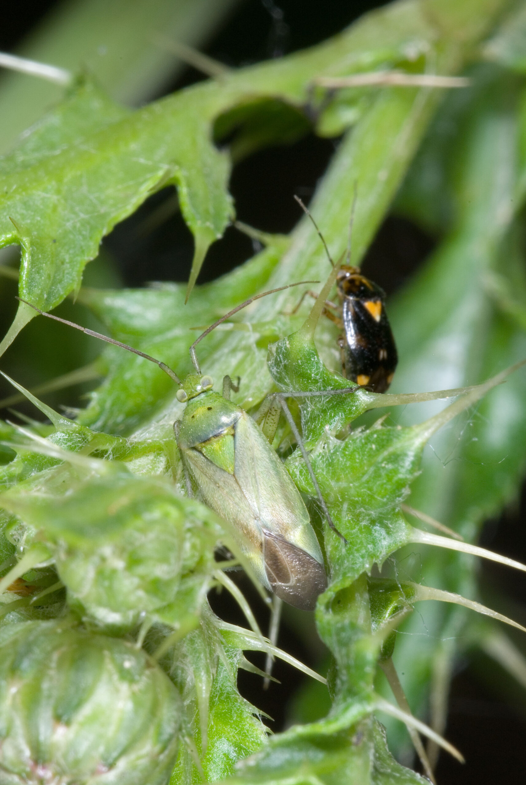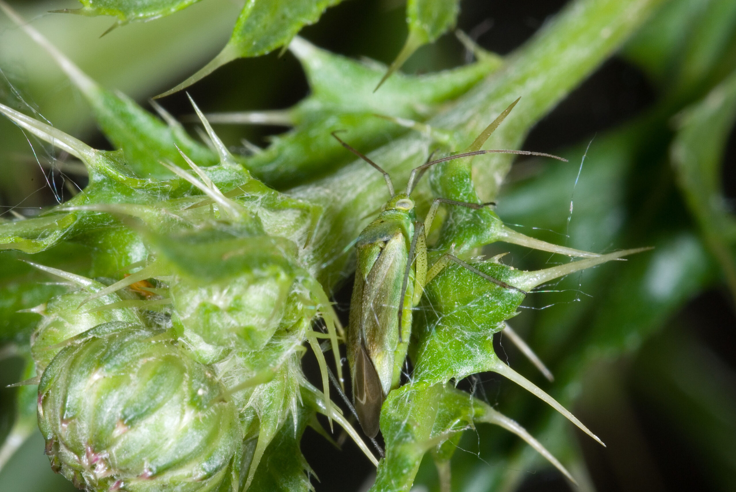 Een aardappelprachtblindwants. Kan groen of geelgroen zijn en licht behaard, te herkennen aan de antennes waarvan het eerste segment groen is en de rest lichtbruin.
