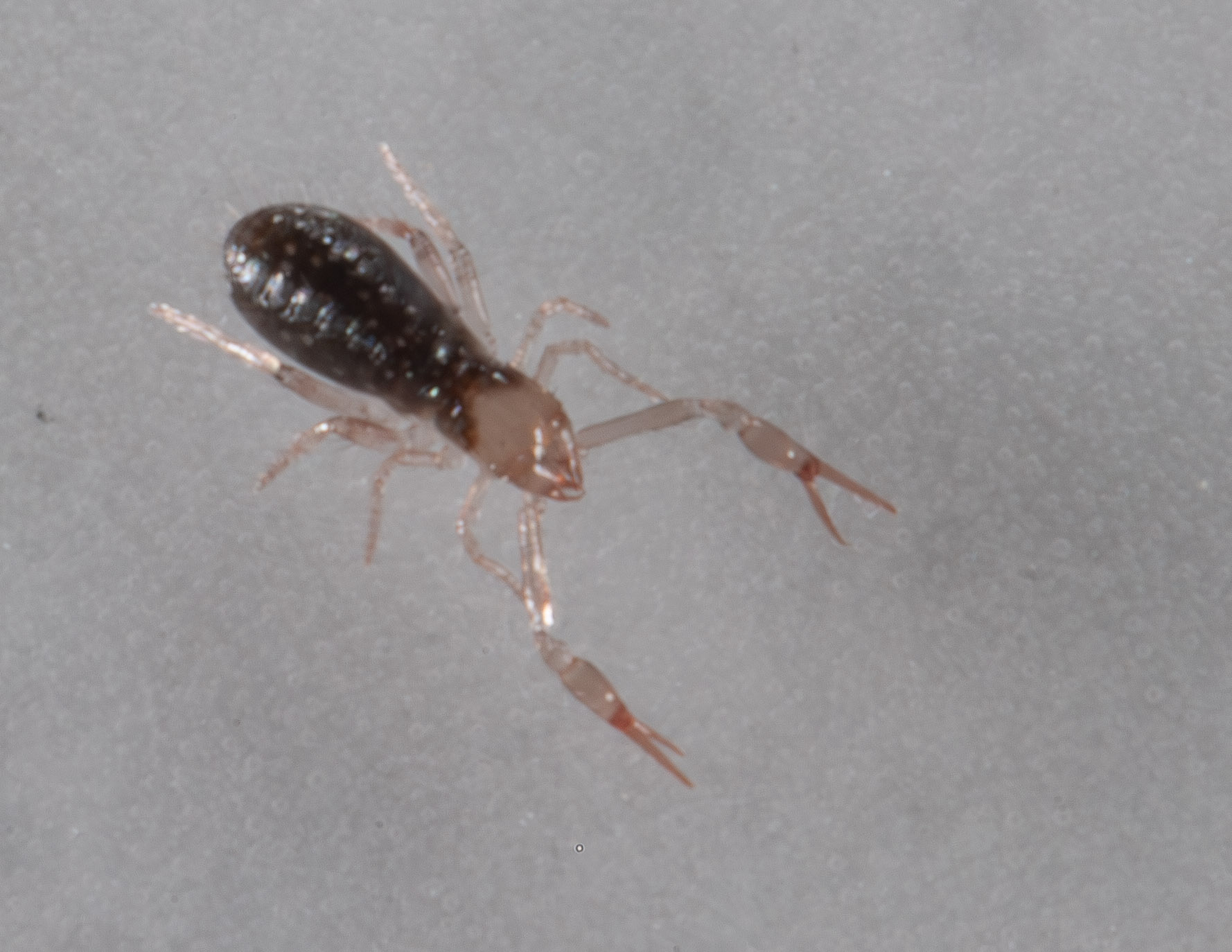 Een mosschorpioentje. Ik ben gefascineerd door die beesten sinds ik er als klein kind ooit een zag in de bibliotheek van mijn vader. Helaas zie ik er bijna geen in de buurt, al zitten ze ongetwijfeld overal.
