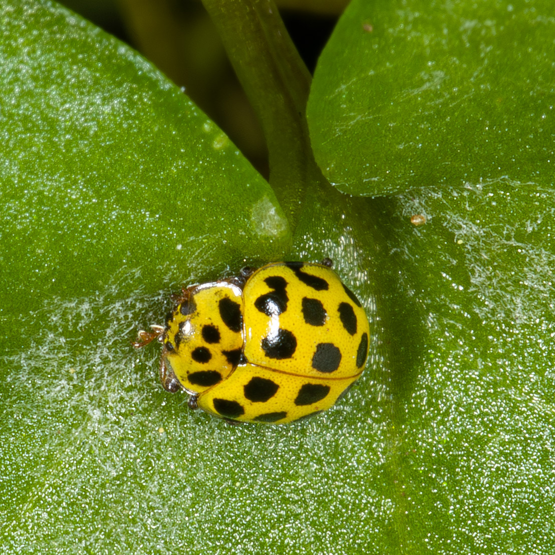 Het citroenlieveheersbeestje of tweeëntwintigstippelig lieveheersbeestje (met een even redelijk letterlijke Latijnse benaming) leeft meeldauw. Wat fijn zou zijn als het die schimmel alleen zou opeten, maar helaas draagt hij ook zwaar bij aan de verspreiding ervan. En de larven ook. Helaas.