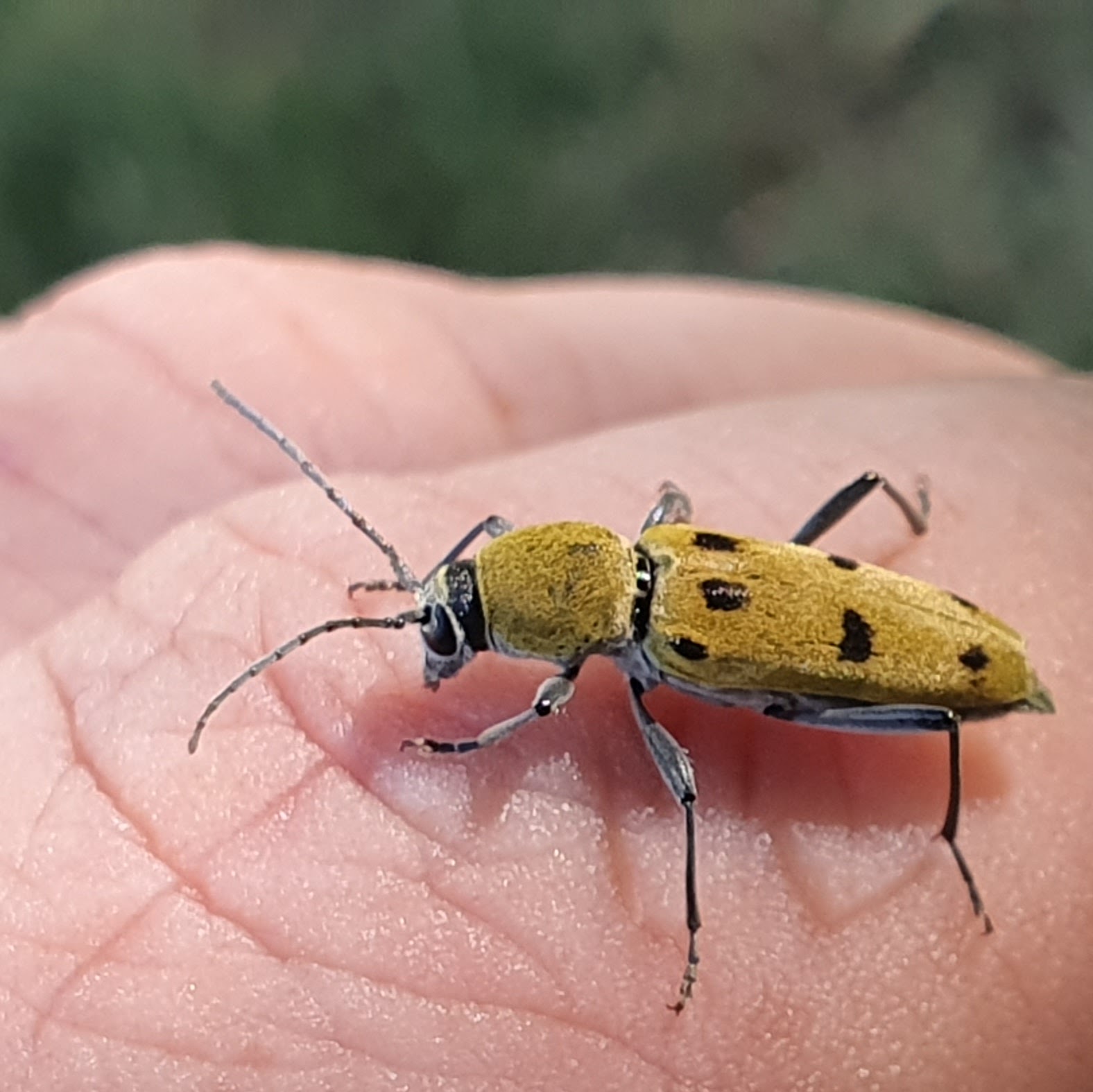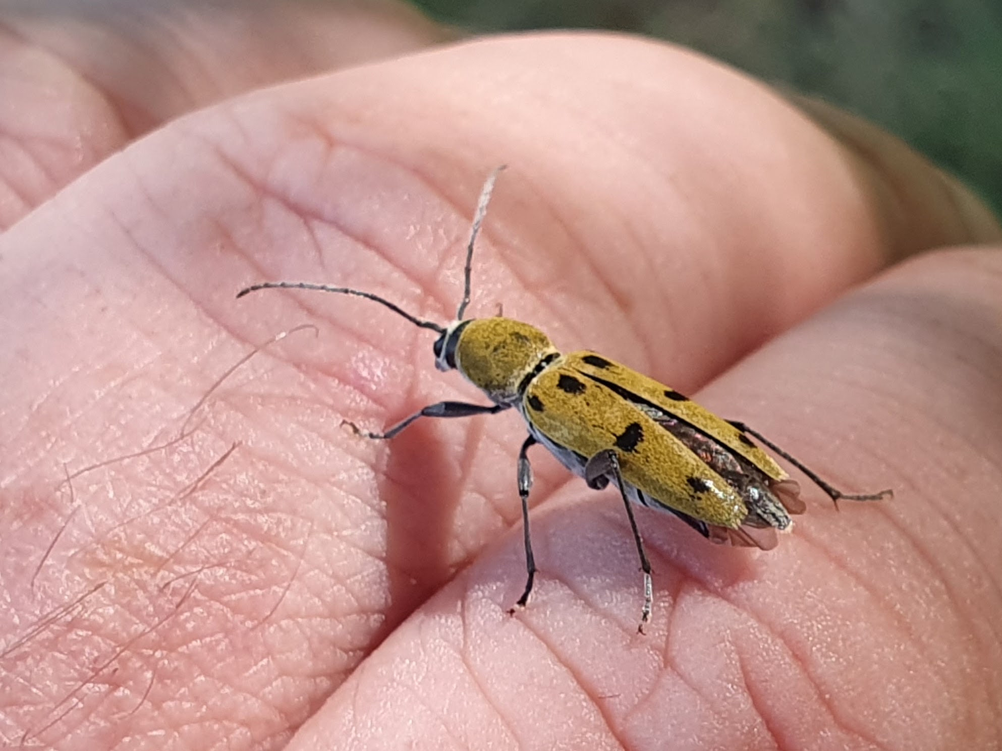 Een boktor zonder verdere naam, die een heel klein beetje doet alsof ze een wesp is, en ineens op mijn hand landde.
